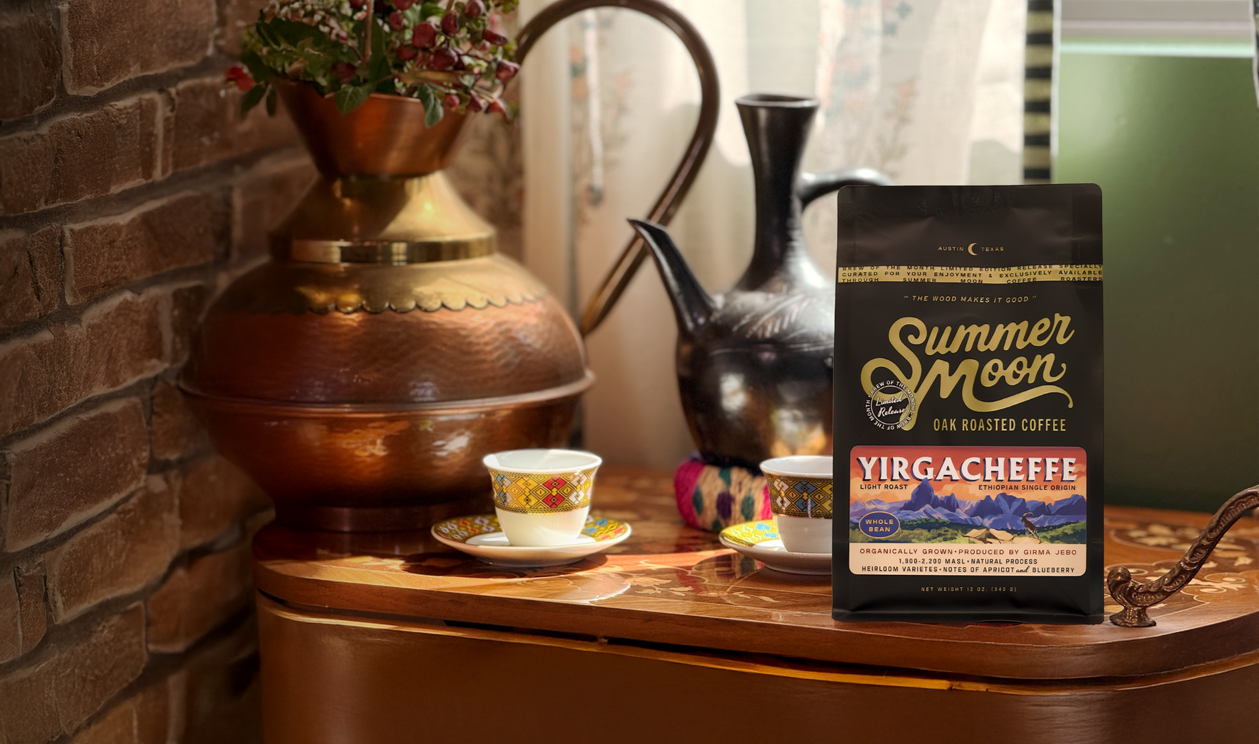 Our organically grown coffee beans are roasted over an open flame in a one-of-a-kind, brick roaster. There’s nothing quite like a cup of Summer Moon coffee.